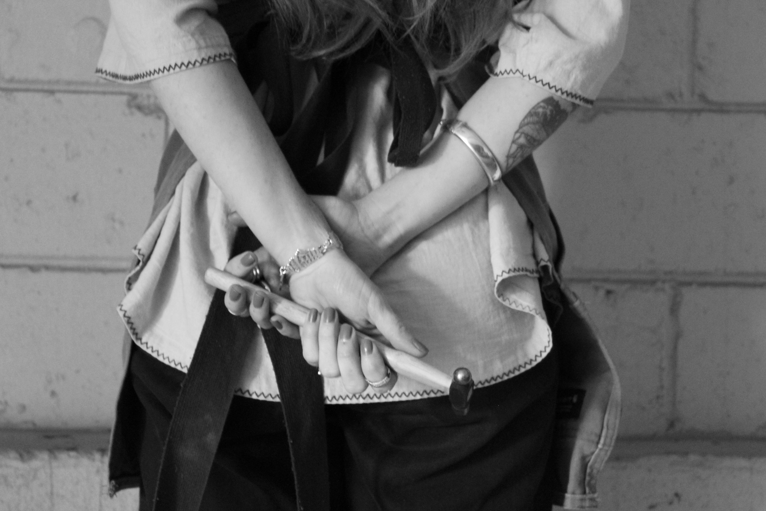 Close-up of a person wearing a tan Carhartt apron and a gray shirt with red stitching on the sleeve, standing against a concrete wall. They are holding a wooden tool, and have tattoos on their arms, including a letter P and some designs, as well as multiple rings, bracelets, and rings on their fingers.
