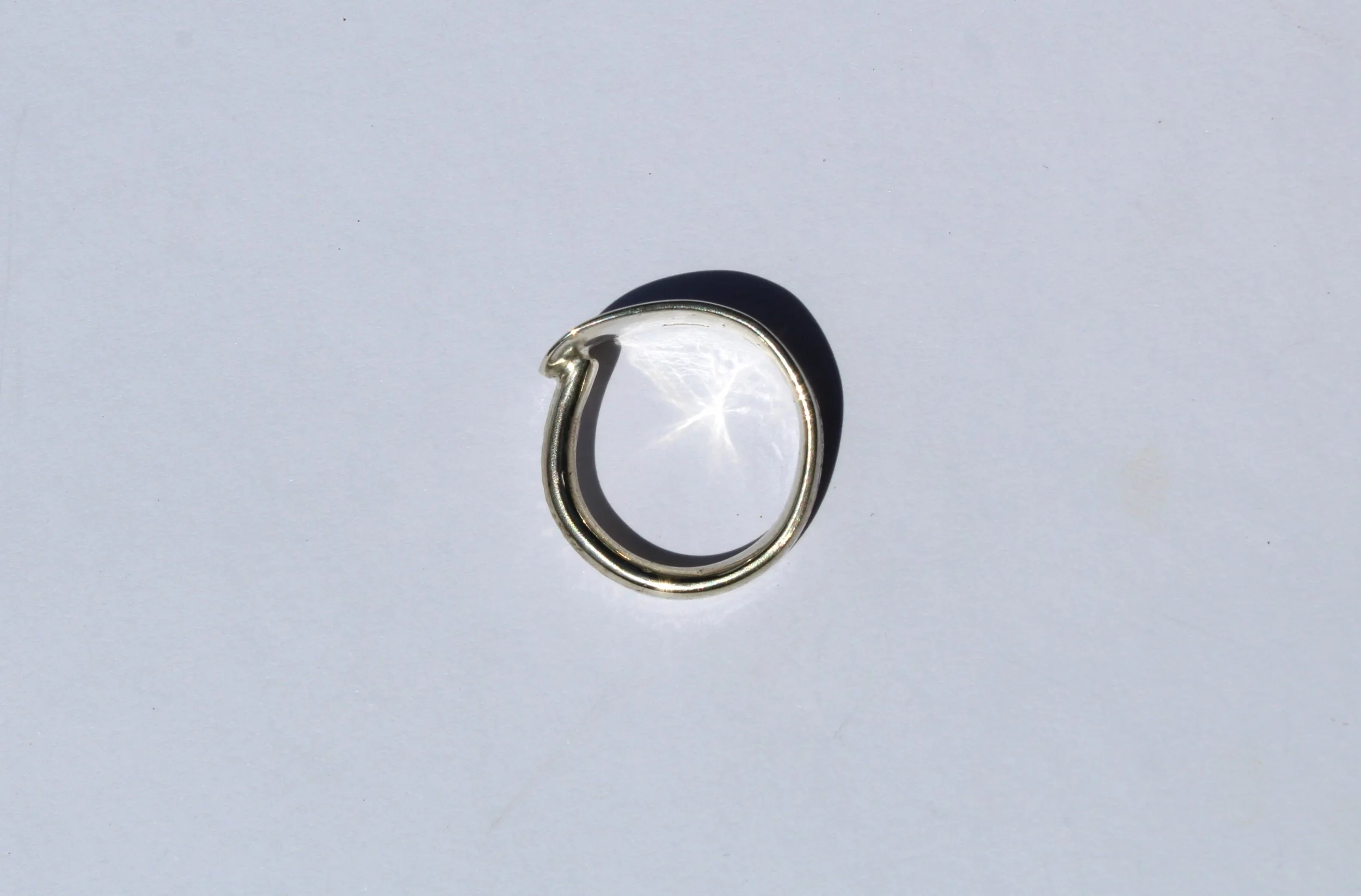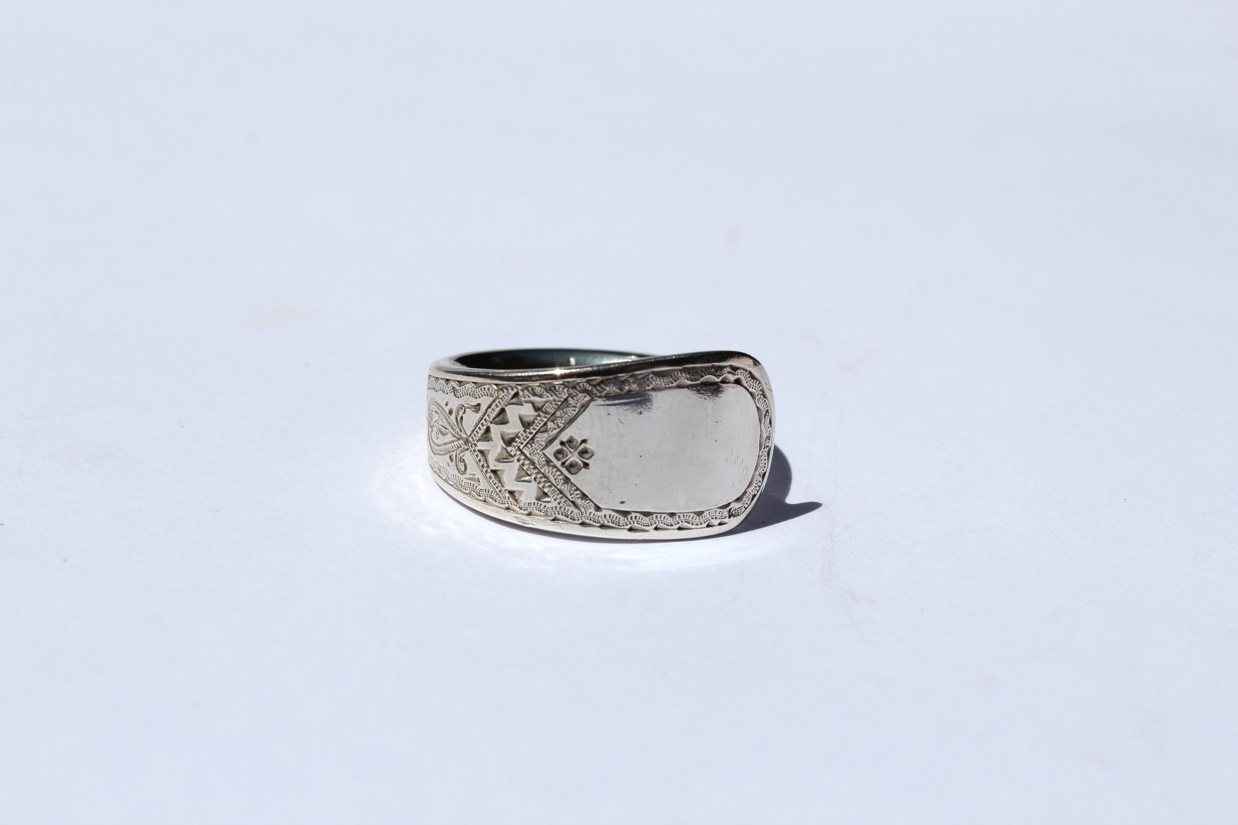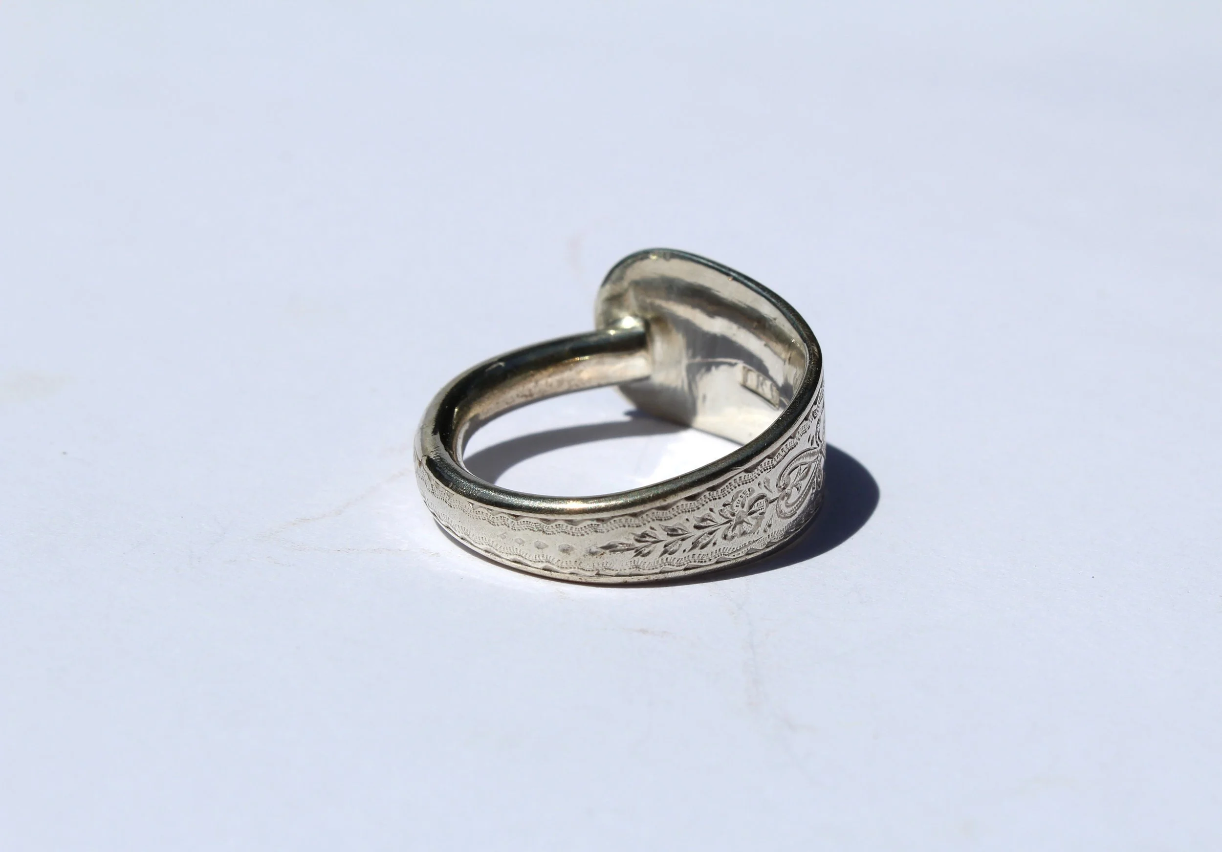 This unusual sterling silver spoon was annealed using heat and bent into shape. Then soldered together at the desired size. I polished this ring but did not want to take off any of the original marks of wear. Antique pieces like this should be celebrated for their form and history which i wanted to respect when changing it from spoon to a ring. It looks lived in and worn from the inside band but the outside details are as crispy and clear.