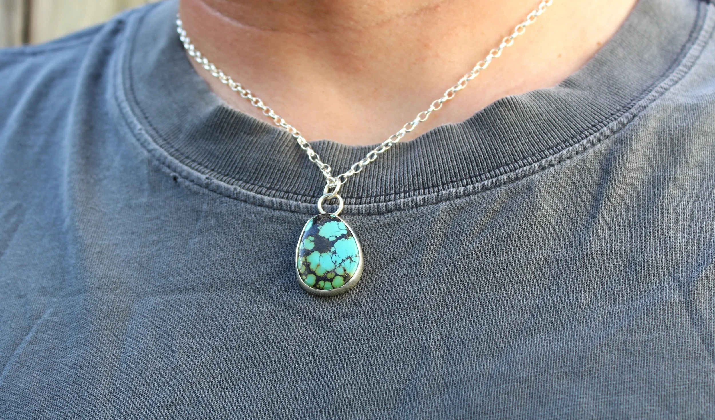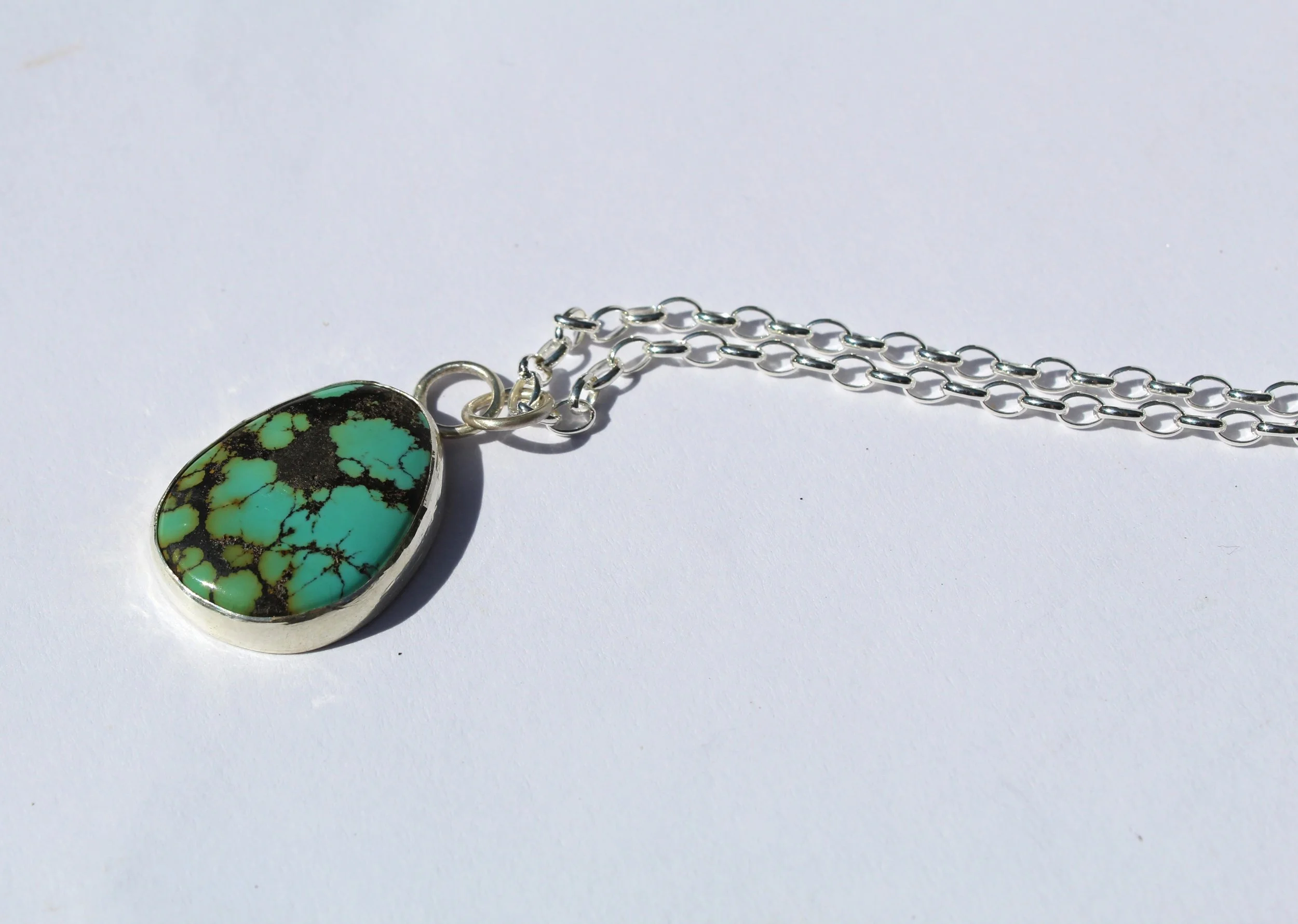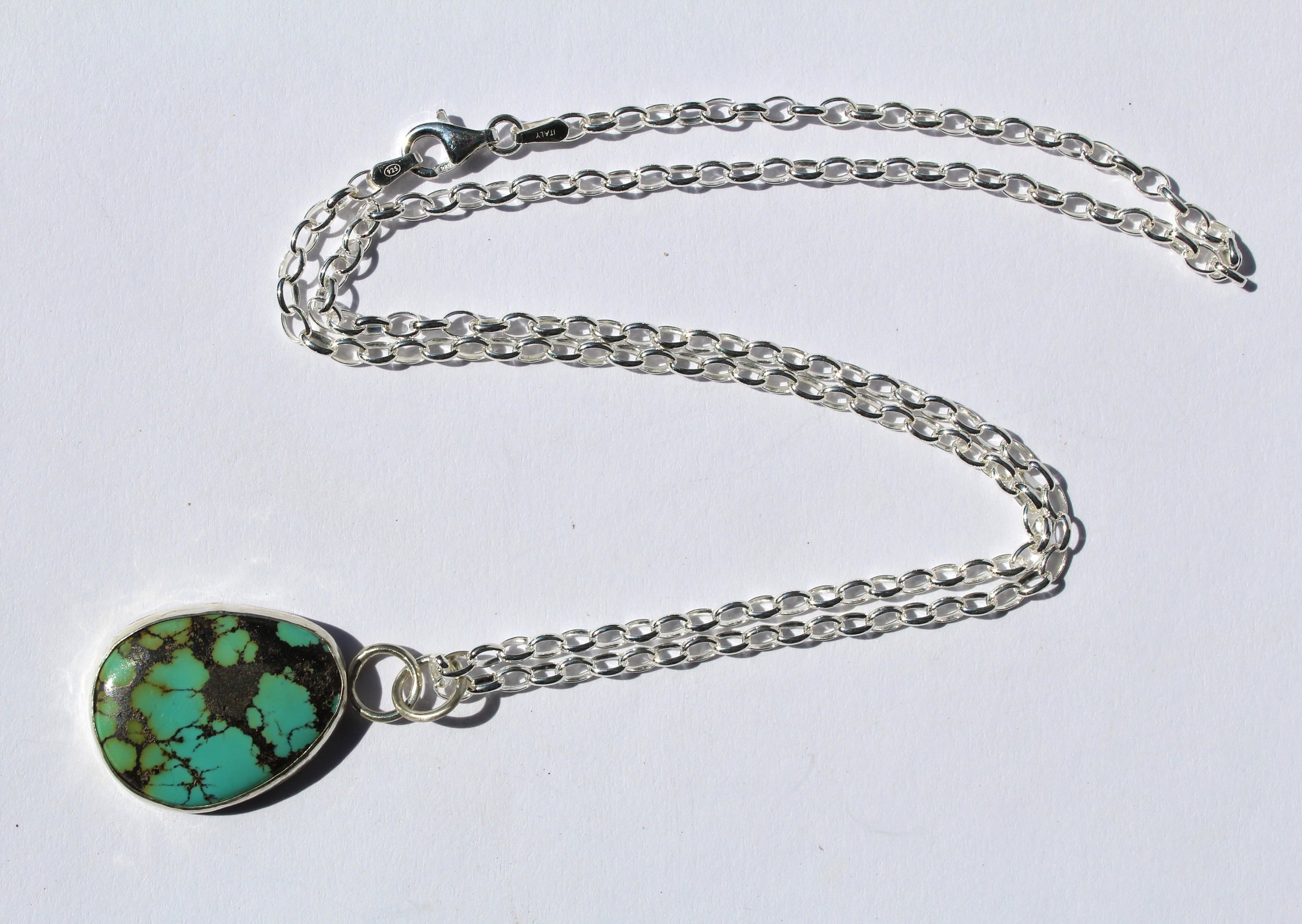 This handcrafted necklace is made form sterling silver and adorns a beautifully vibrant Bao Canyon Hubei Turquoise gemstone. This natural gemstone originates in the Chinese province of Hubei and includes the Yungai Mine also known as the famous Cloud Mountain. The colors of this Bao Canyon Turquoise pendant are wonderful, with variations of greens , blues and browns. The stone is bezel set by hand using sterling silver.