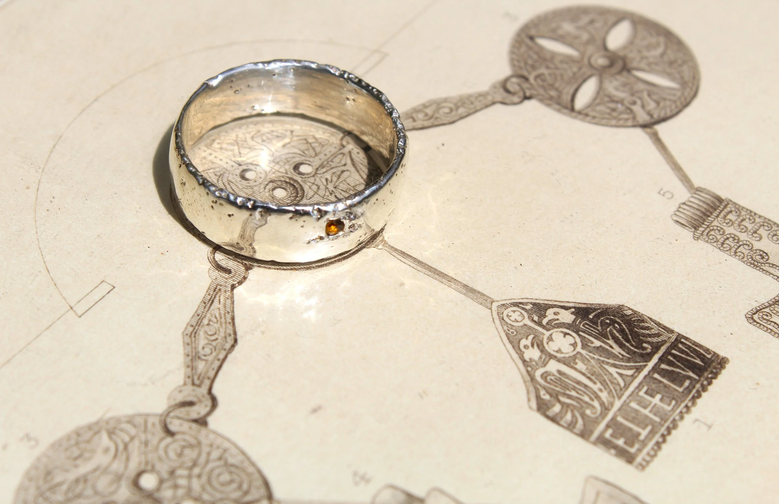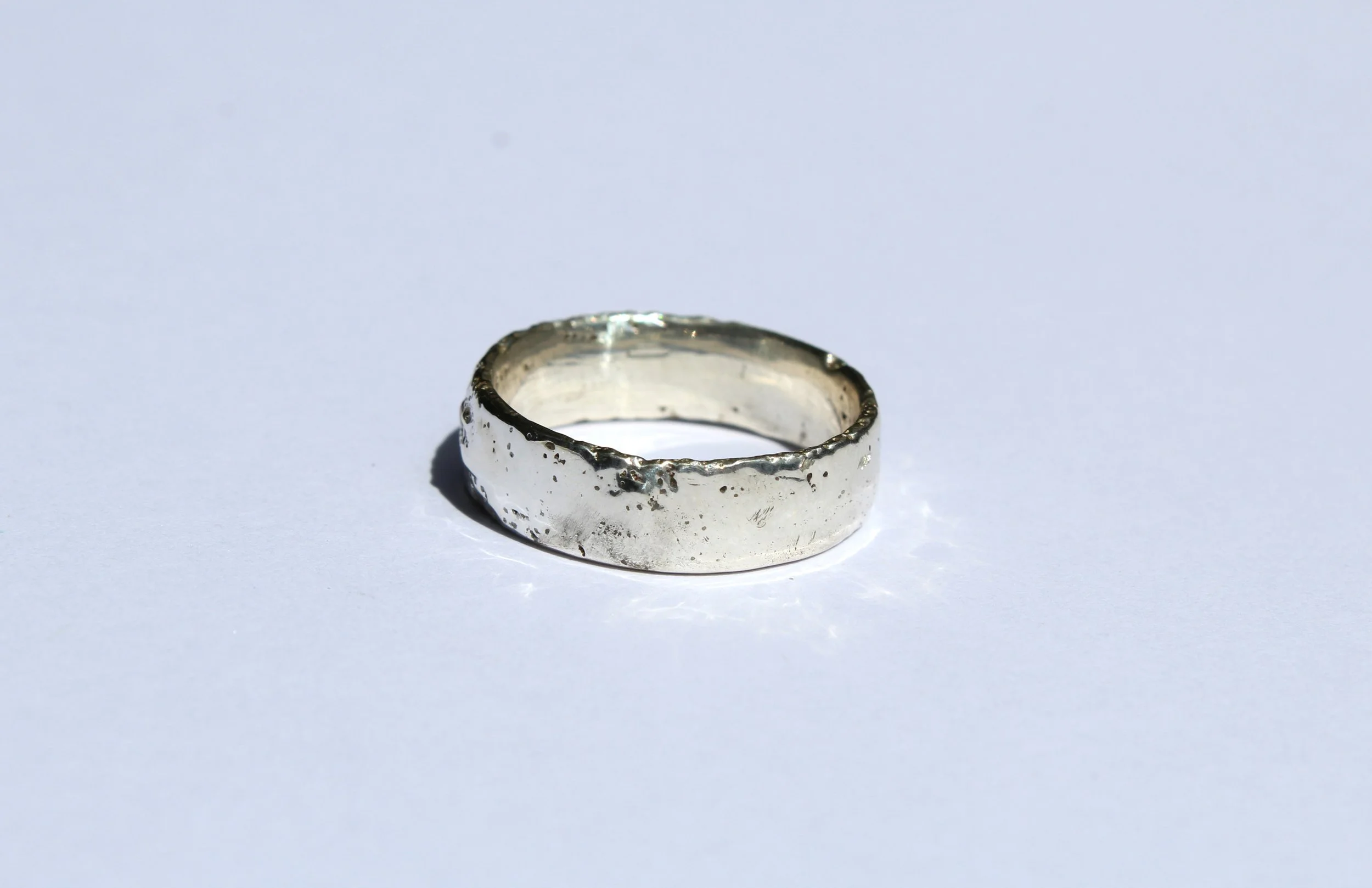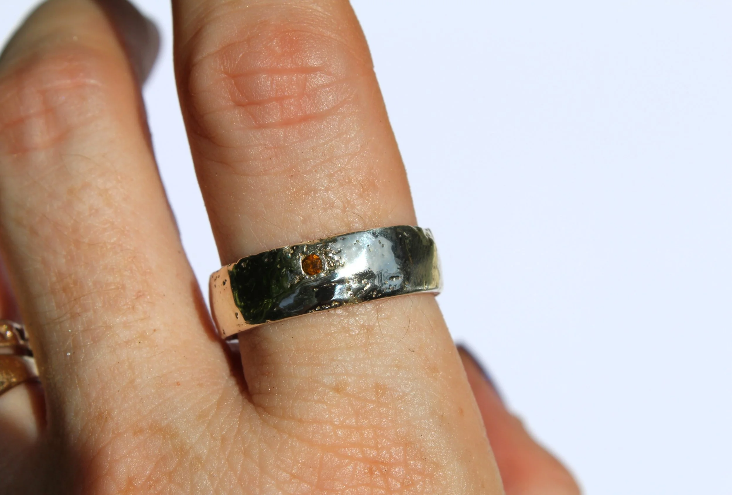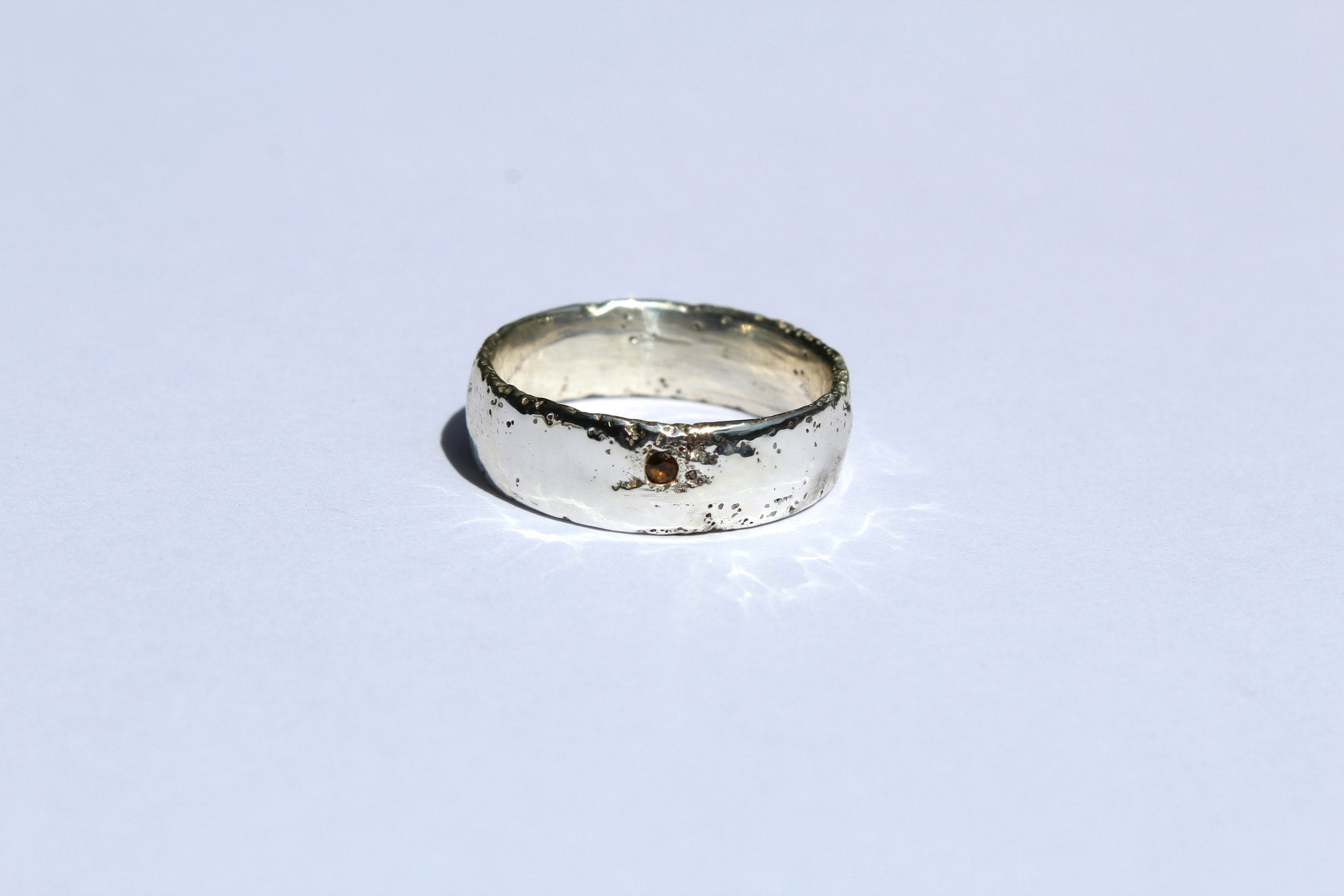 Our Citrine band is cast in sterling silver and made from an original hand carved wax design. This beautiful and vibrant little citrine gemstone is then cast into the mould , allowing molten metal to flow around it, casting it in place allowing for a completely unique organic finished product .Imprints of the sand from this casting method are left in the silver for a rustic worn finished. Beach sand is also added to give this piece a raw and rugged texture.