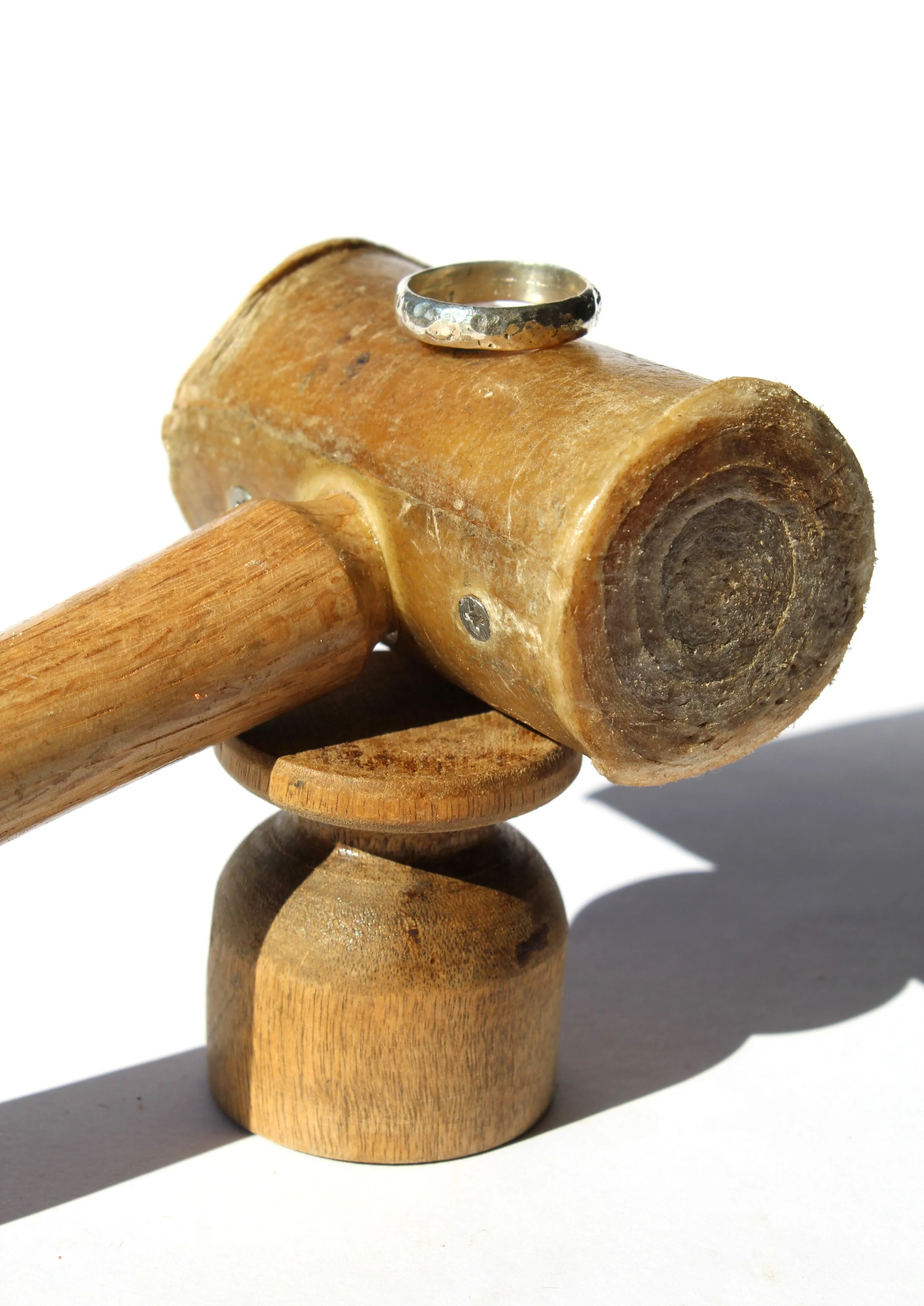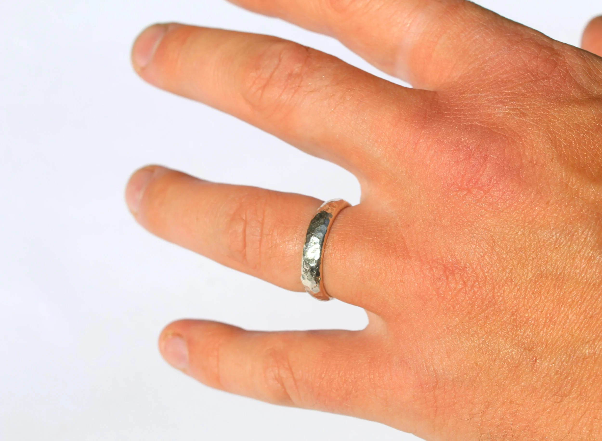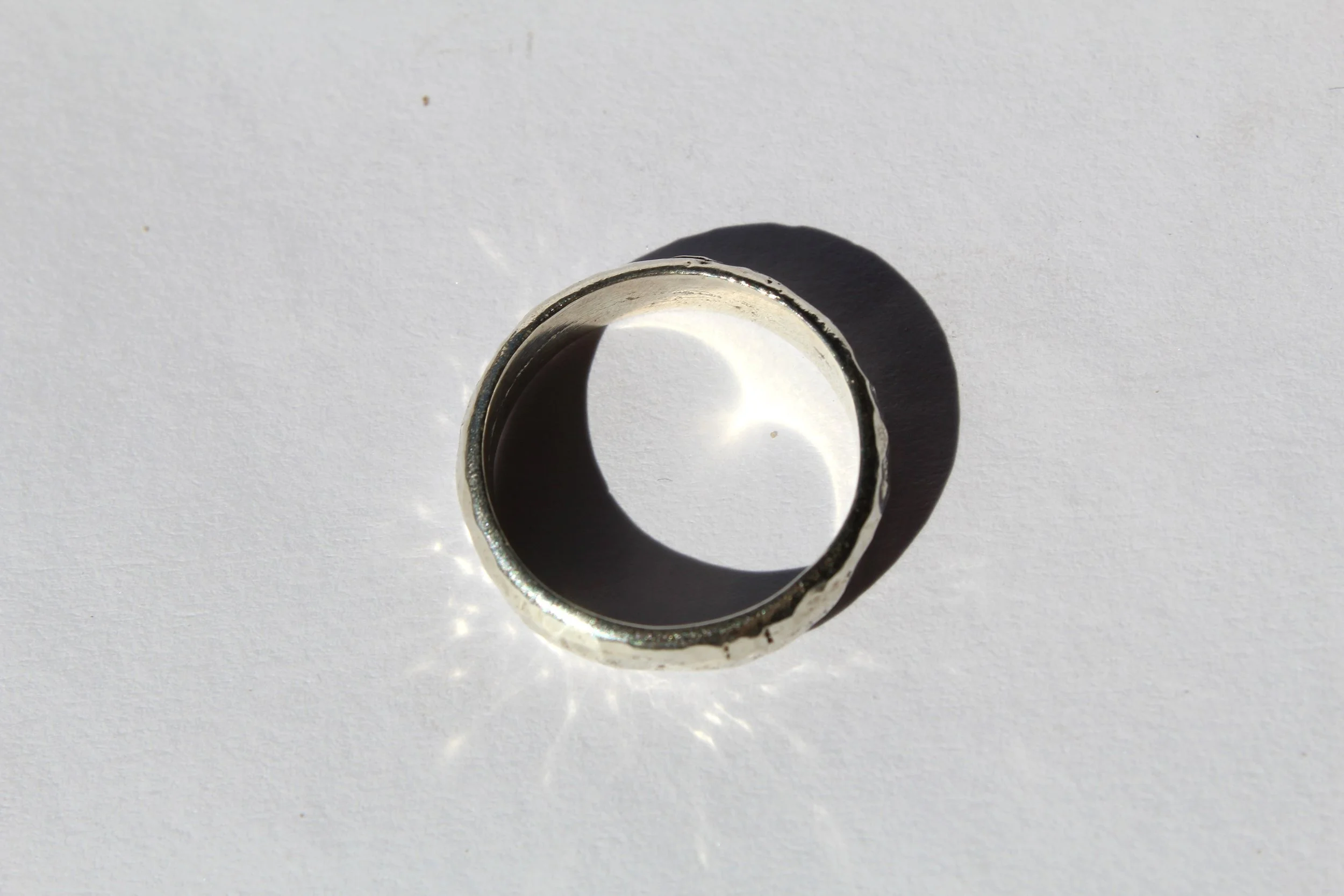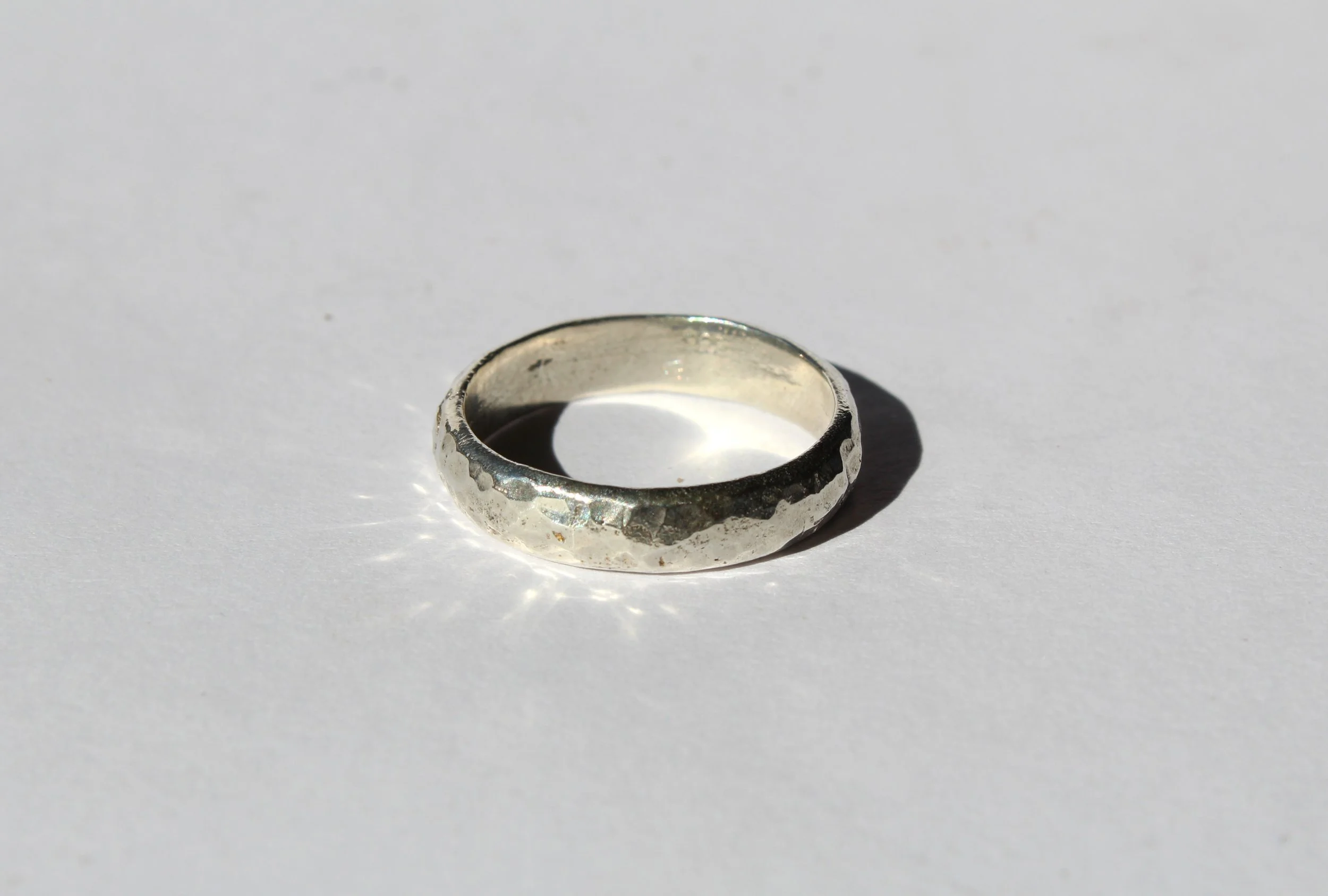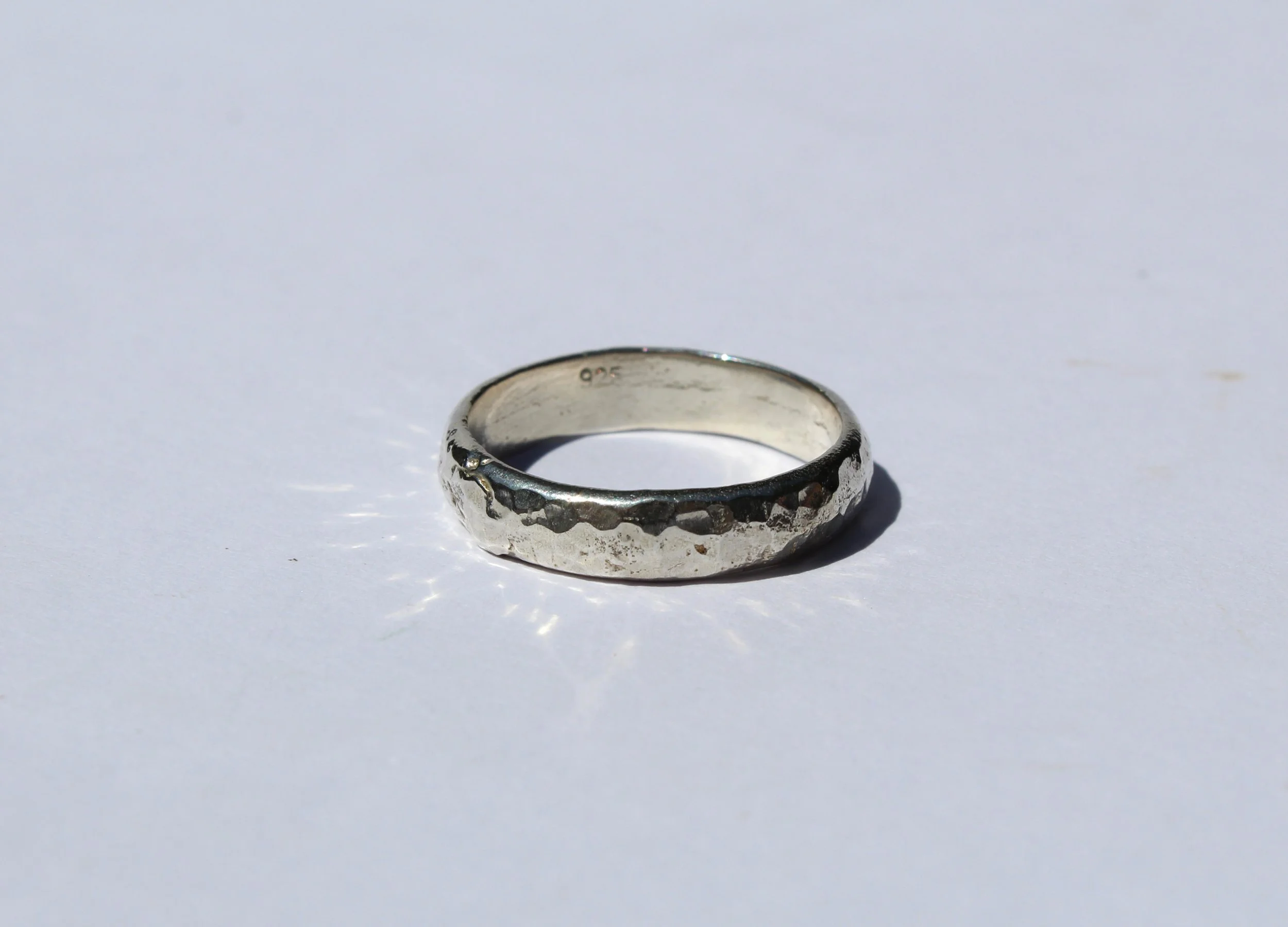 Our hammered men's ring has been sandcast in Sterling silver, with a hammered surface and polished finish.