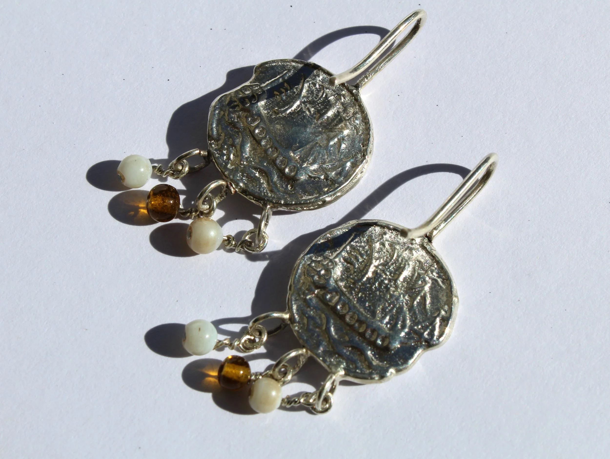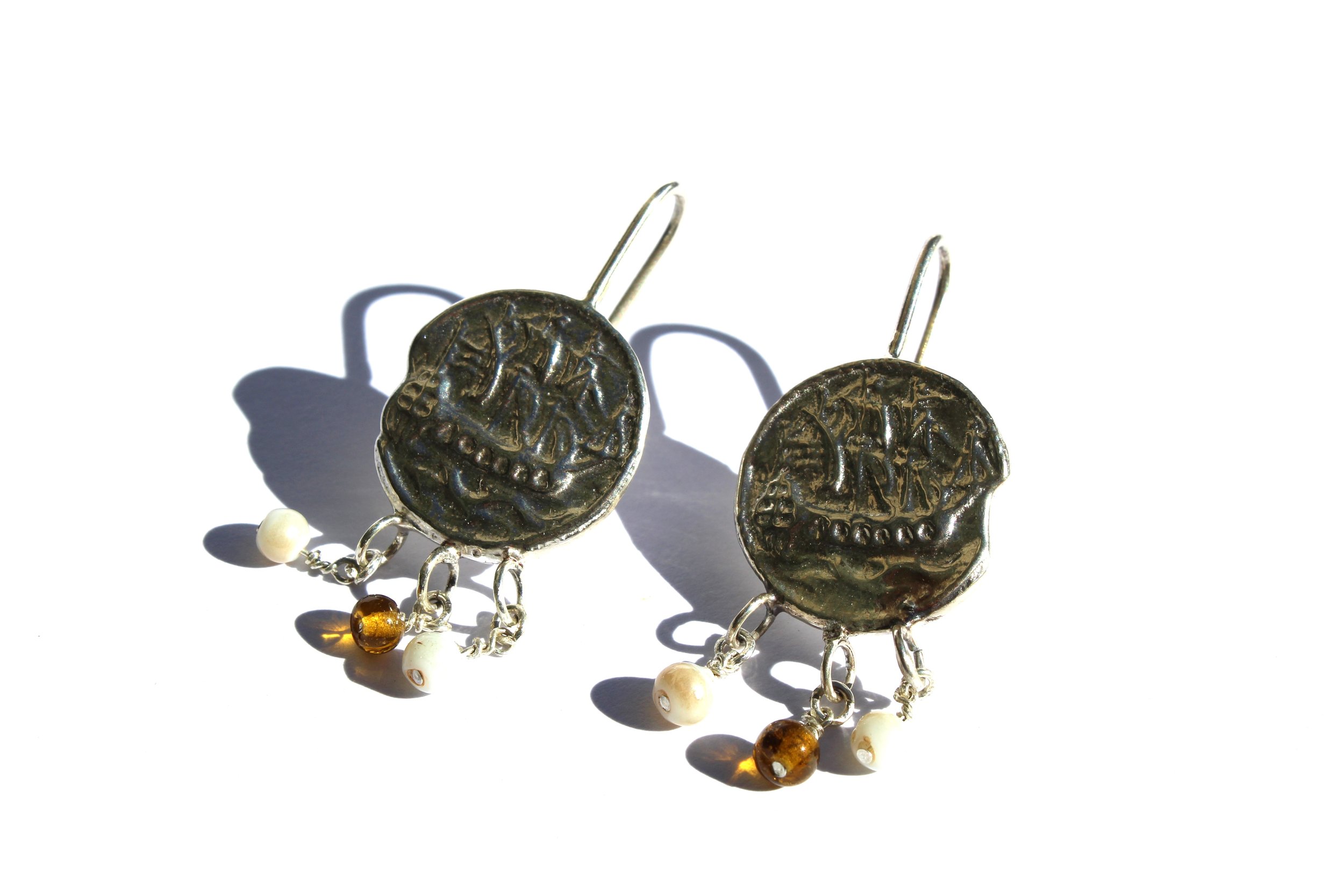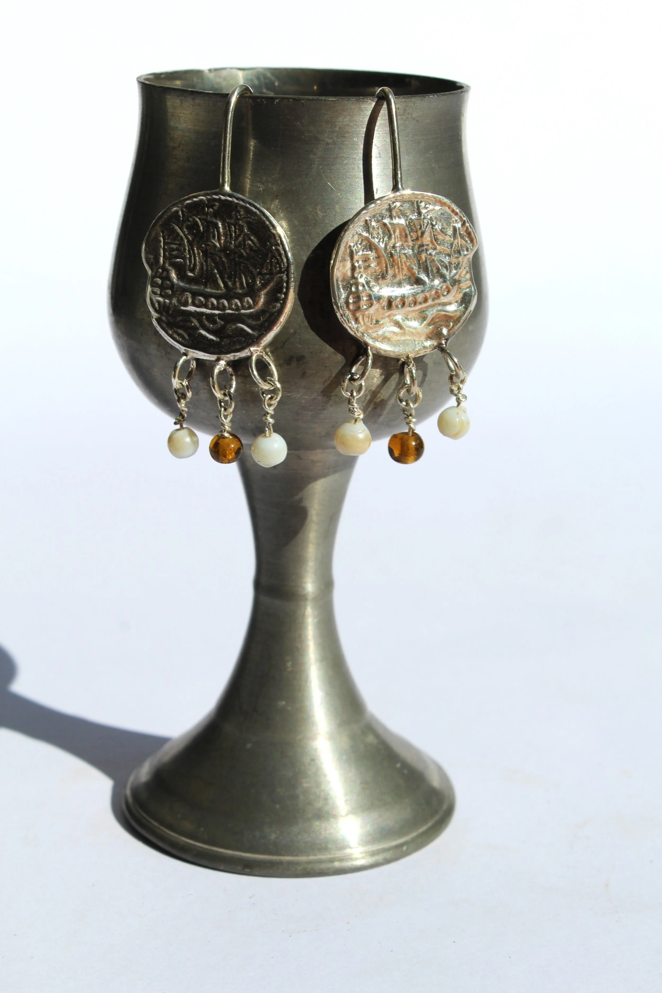 These Seafarers luck sterling silver earrings, born from an 1700s French button depicting a galleon, are a testament to the power of fusion. Imagine a love affair between history and artistry. The antique button, a miniature masterpiece in itself, is reimagined as a modern adornment. Captured in sterling silver to preserve the beauty of a forgotten token. Forged from the spirit of adventure. Imagine the pirate captains of old, charting their courses by the stars, their ships cutting through the waves. That same spirit of daring and independence is captured in every detail. Vintage beading adds a touch of delicate intricacy, blurring the lines between eras and styles. a unique statement piece for those who appreciate the beauty of the unexpected and the allure of the past.