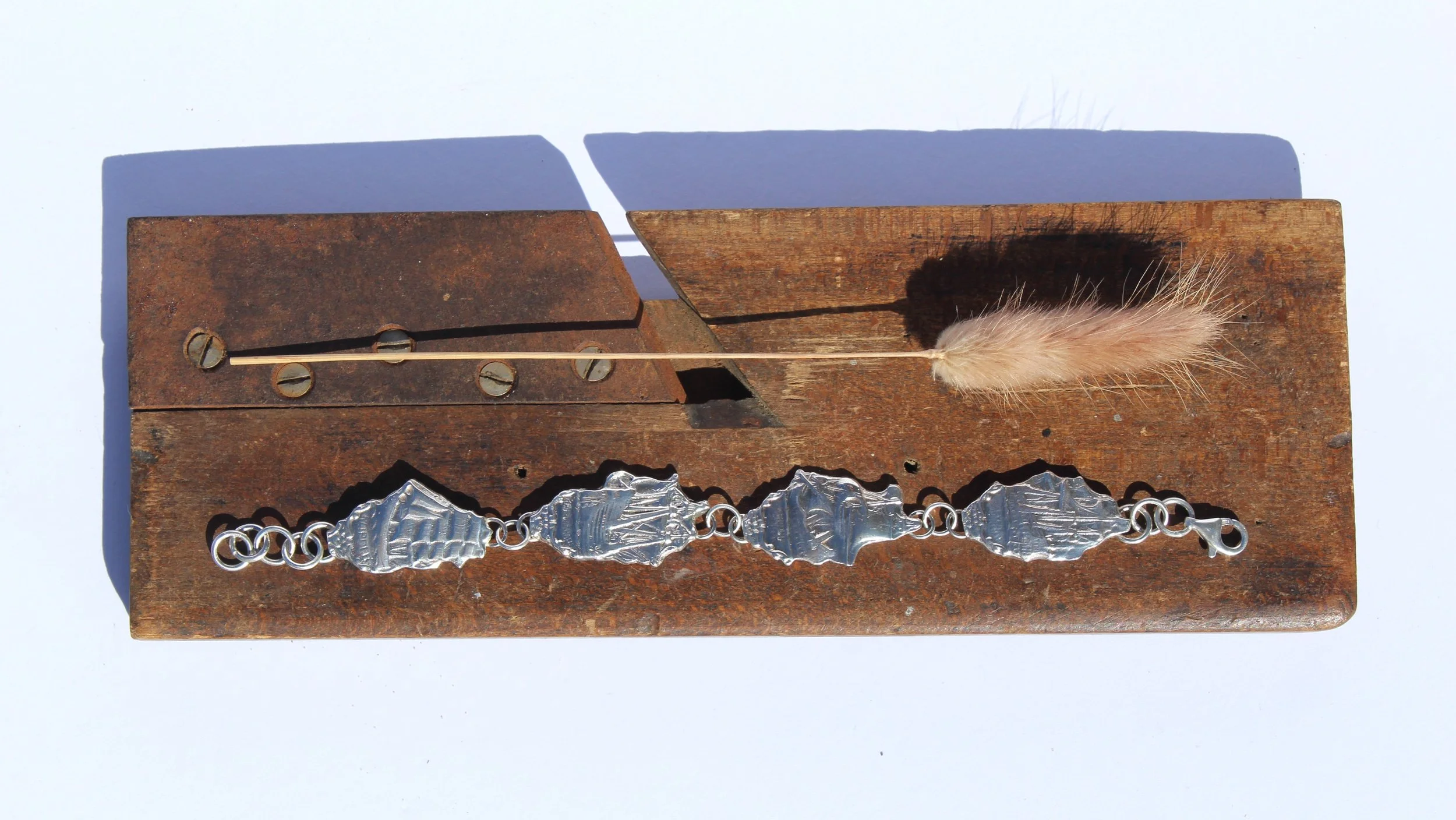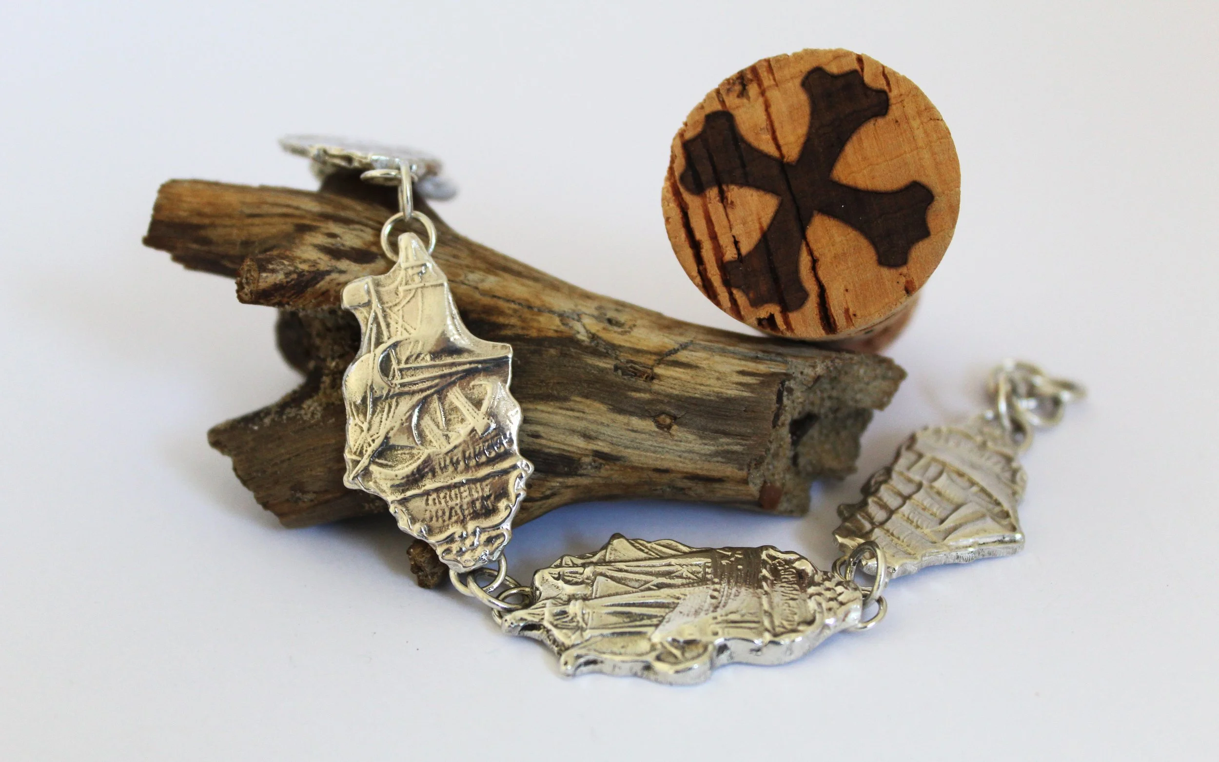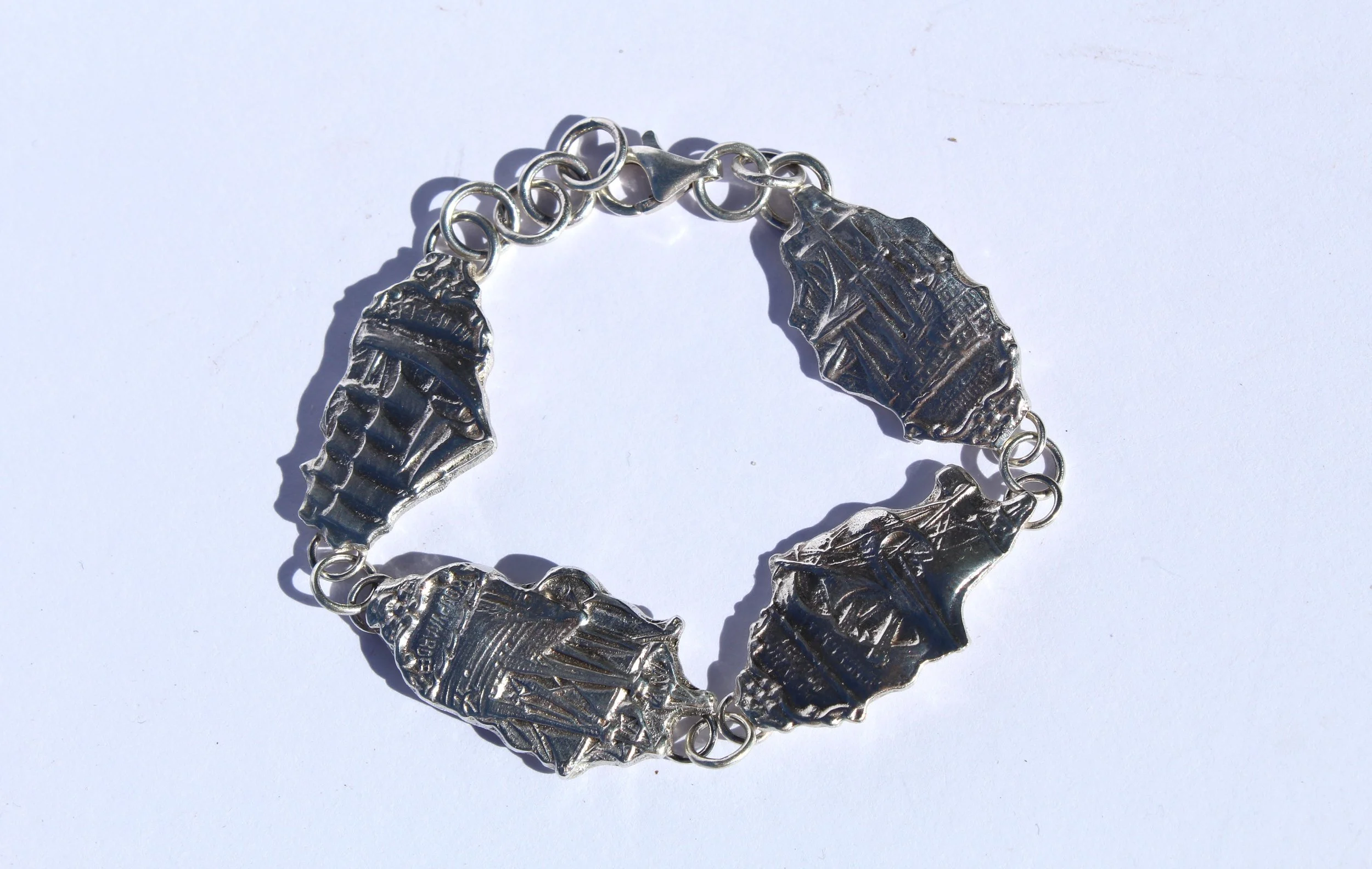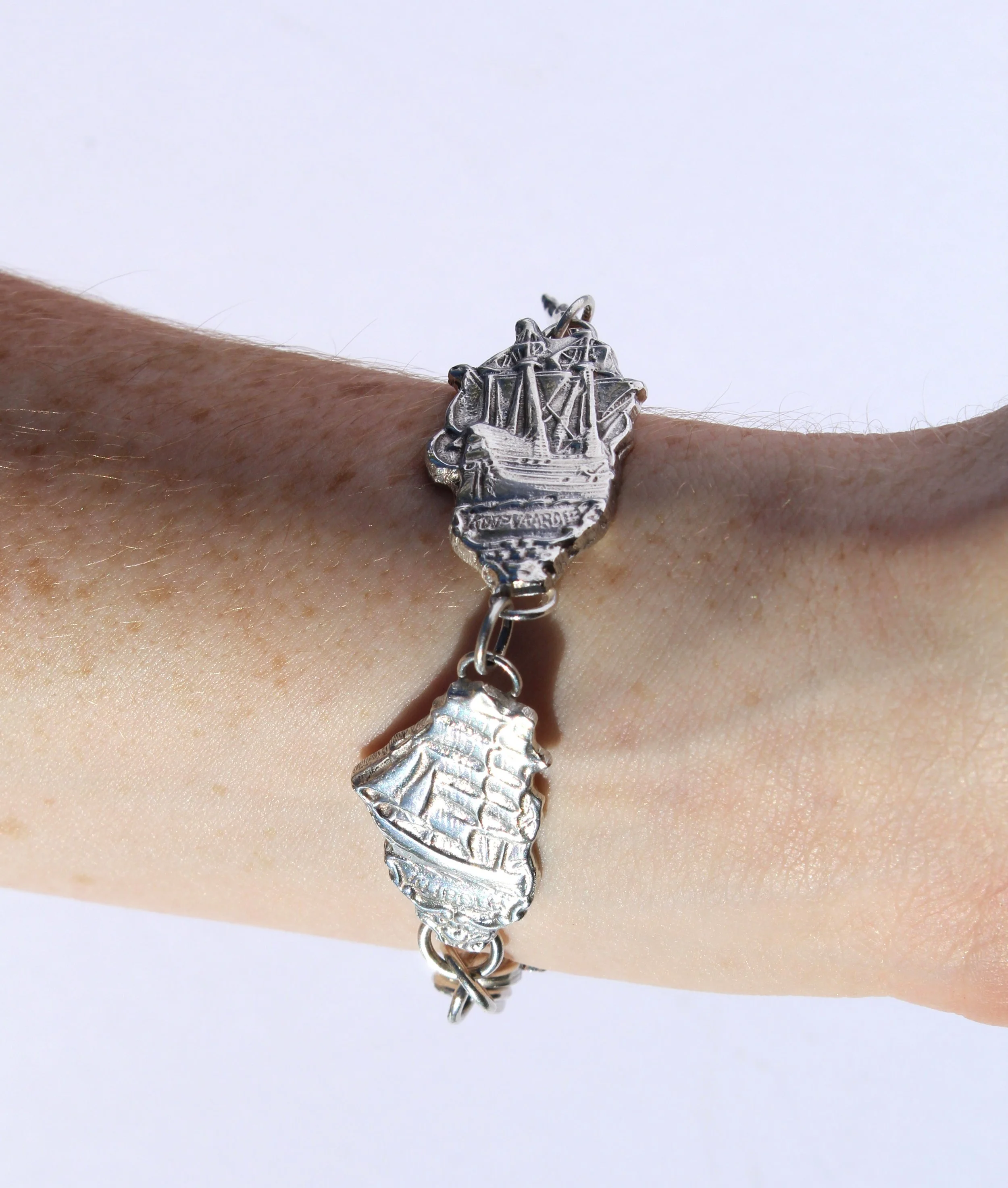 The Fleet Bracelet has been carefully curated by hand using the ancient technique of Sandcasting. This bracelet showcases 4 different galleon ships which wrap effortlessly around the wrist. A sterling silver clasp secures this chunky bracelet and you have three length options to wear it at . Cast from the tops of disregarded antique spoons these beautiful ships will be kept alive by the wearer. Made with solid sterling silver 925. length is 18.5cm-20.5cm
