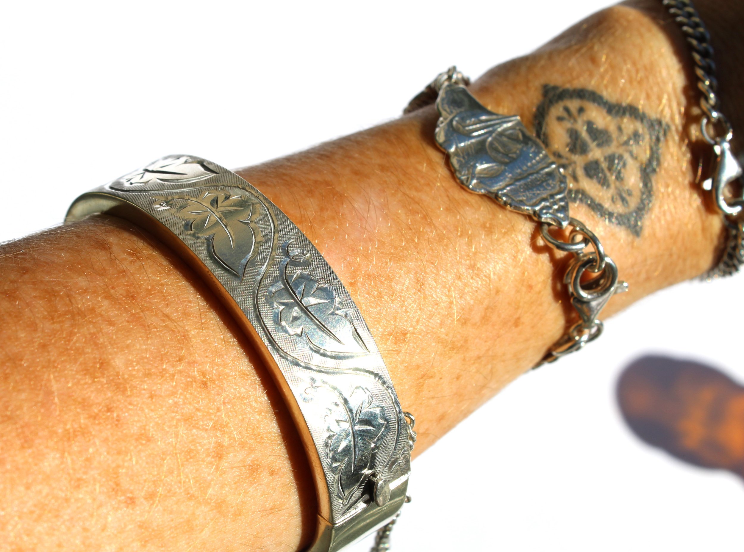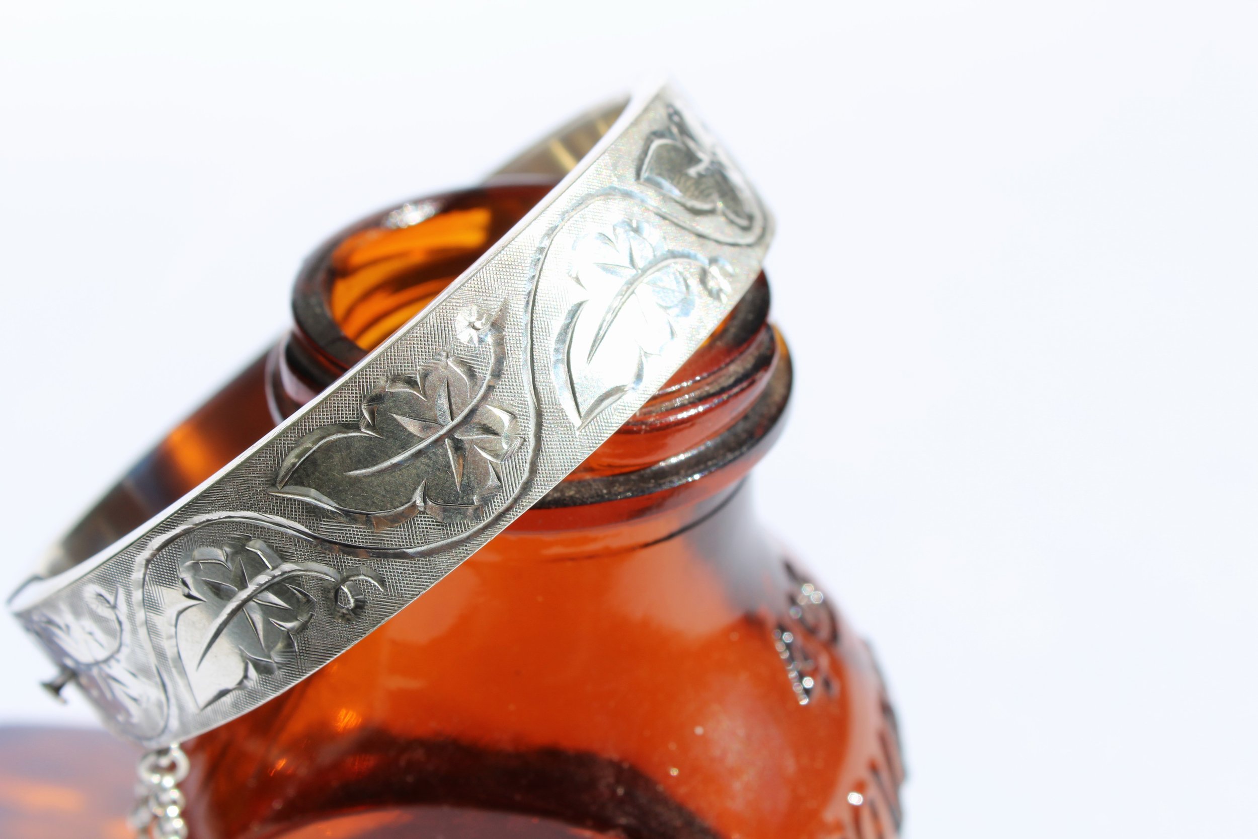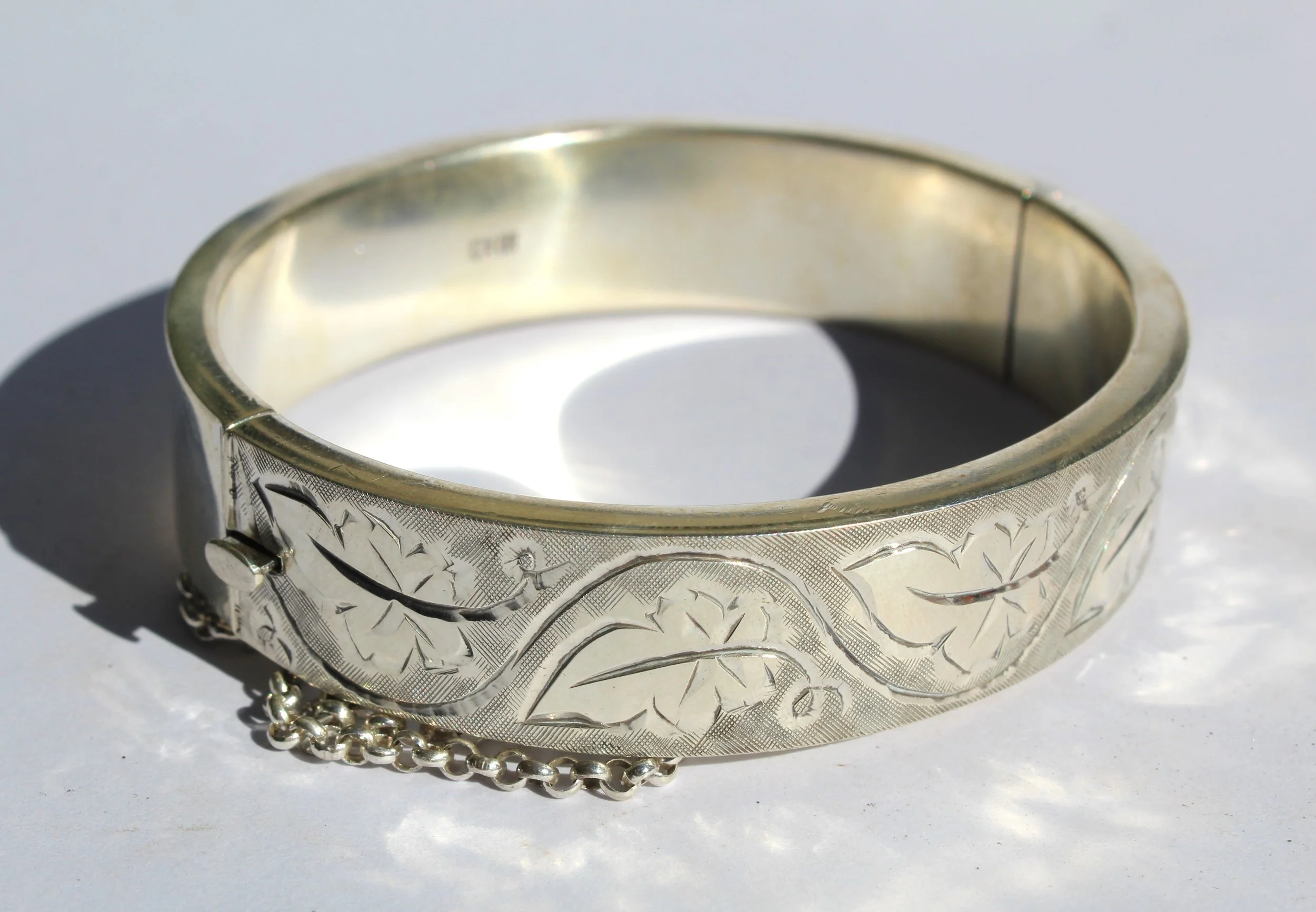 A delicate symphony of etched leaves danced across its surface, their intricate details catching the light with every movement. A charming belcher safety chain, ensured the bangle's precious cargo wouldn't be lost. Despite its vintage pedigree, the bangle remained in remarkable condition, a testament to the enduring quality of sterling silver and the careful hands that had cherished it for generations.