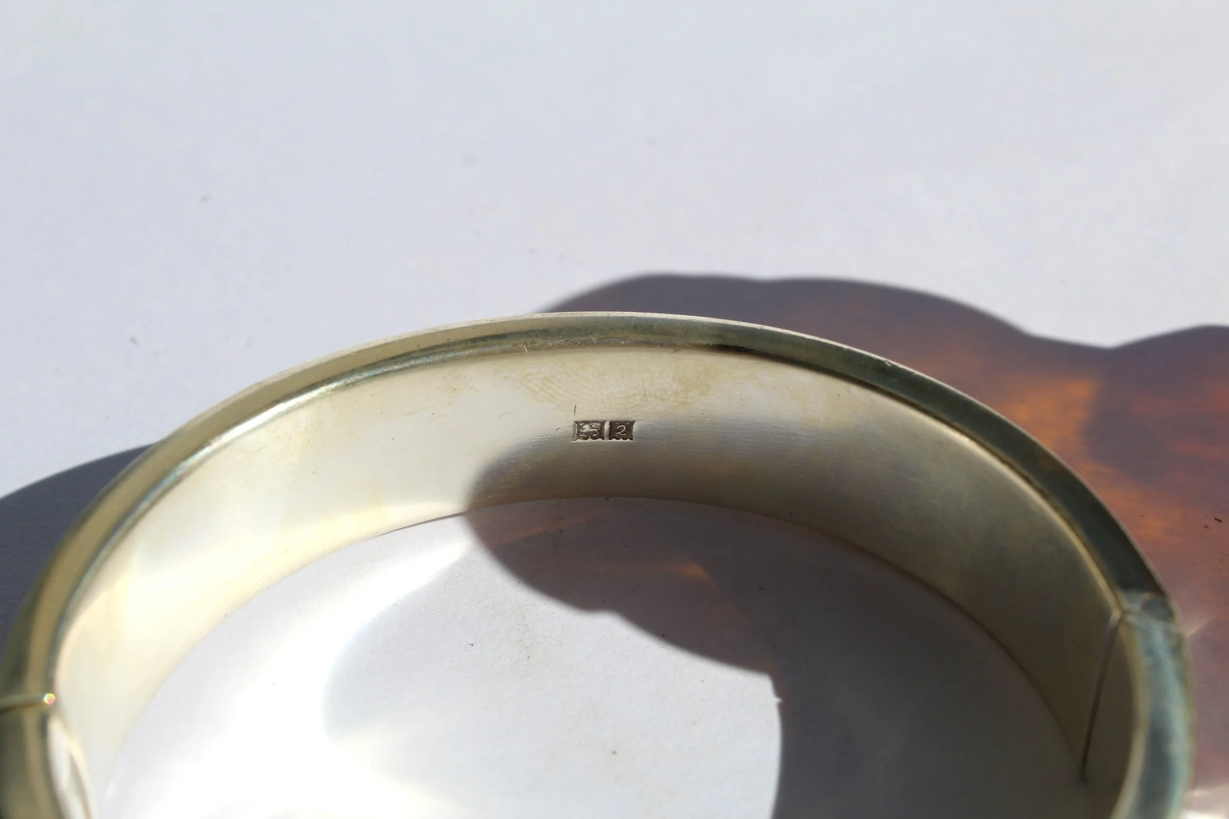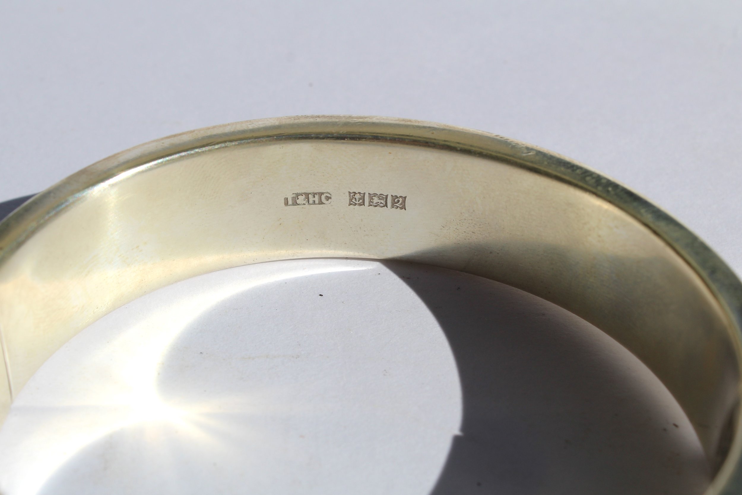 This piece is fully hallmarked on both sides of the inside of the bangle. with the makers mark ( T & HC for Turner and Simpson, a well known Birmingham silversmithing company in the mid twentieth century) . A lion for sterling silver, an anchor for Birmingham and an L for 1960’s.